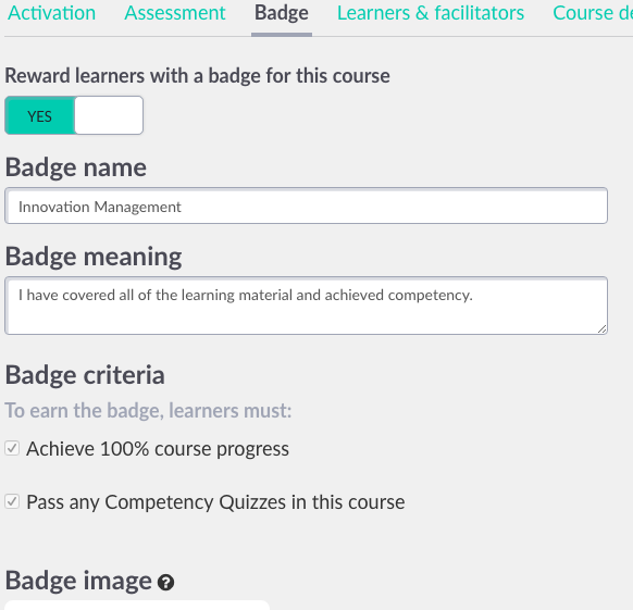 You can determine course by course whether to offer a badge for completion. A Manage Administrator can set this up on an offering by offering basis. On the Badge tab of a course offering in Manage, you can select to award learners with a badge for the course. You can edit details about the badge and we provide you with a default name and description to get you started.