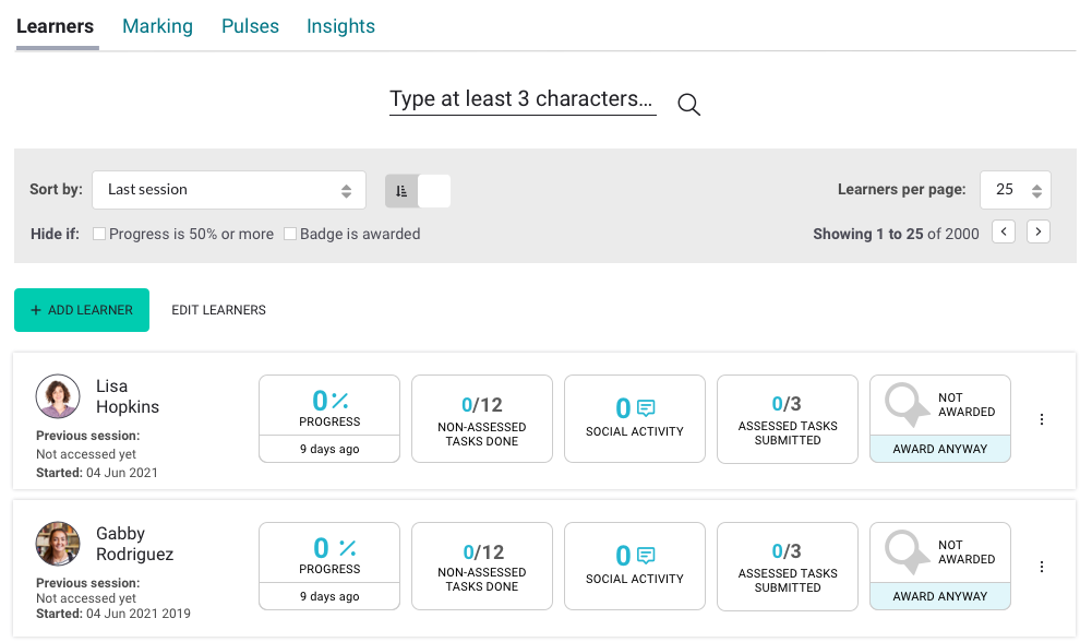 If we sort our learner list by Last session in ascending order, we can see which learners are yet to log in.