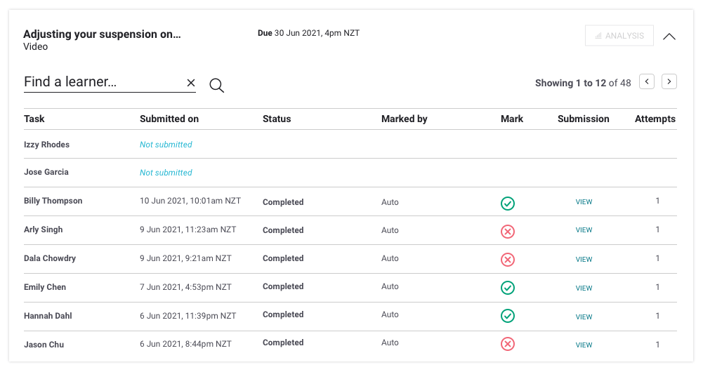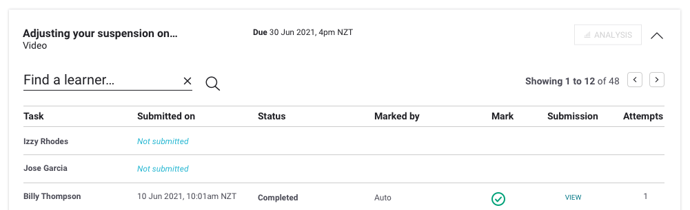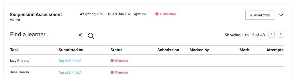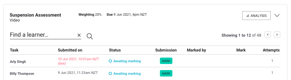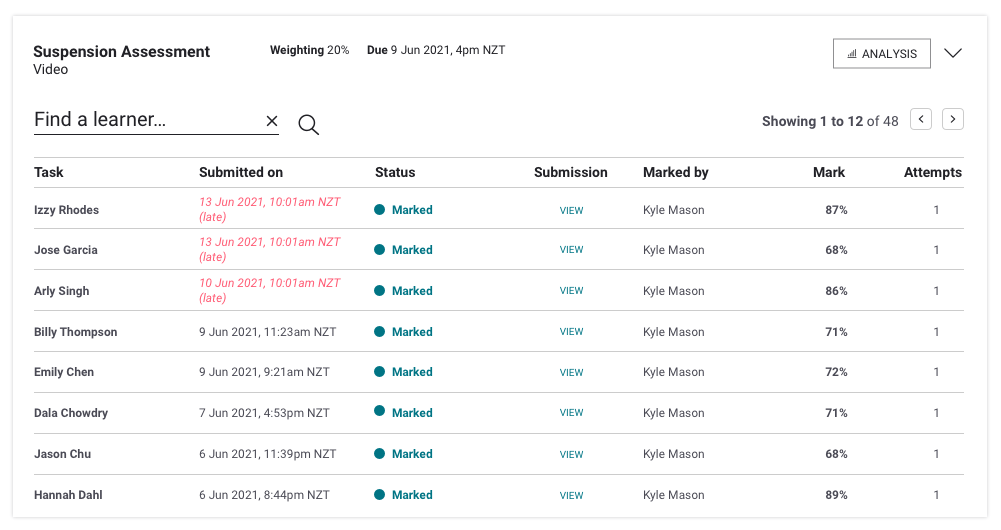 As learners submit their assessments, Kyle can easily spot what needs marking.