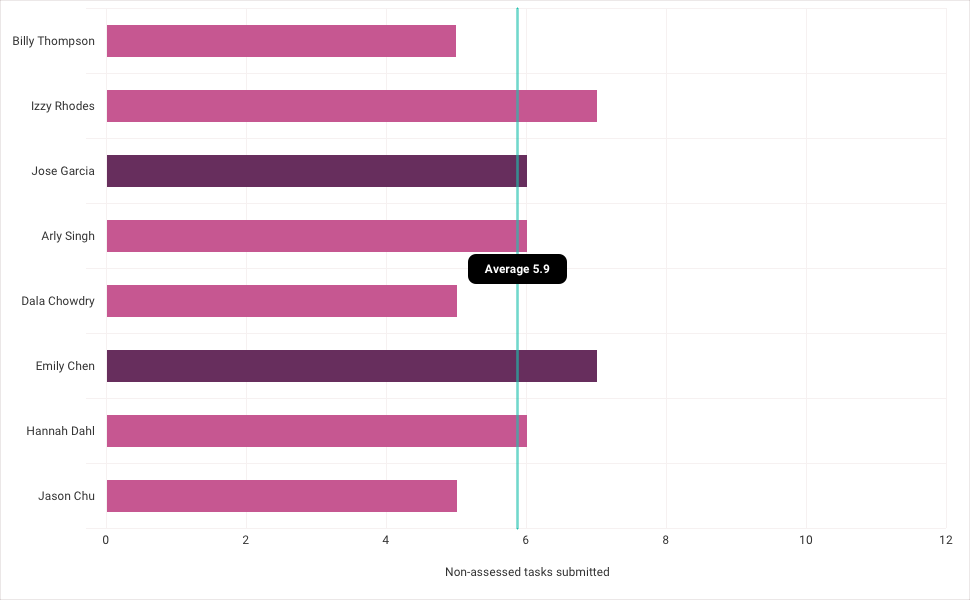 For example, looking at non-assessed tasks submitted (and knowing that there were a total of 12 non-assessed tasks) we can see that the majority of the class were not submitting all the non-assessed tasks. However, the large majority of the class still achieved in the assessment. So… this might prompt Kyle to rethink how many non-assessed tasks the course needs. And to analyse which of those tasks directly contribute to the outcomes and assessment.