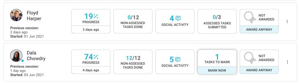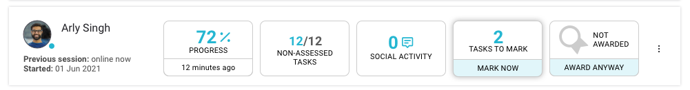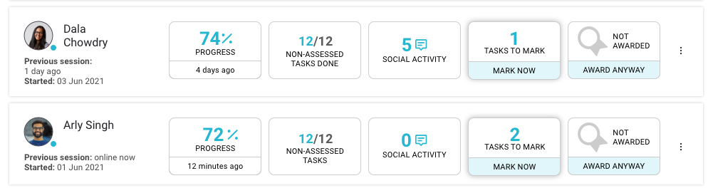 Taking a look at the data for Arly, we can see that he hasn’t been contributing to the welcome discussions, though he has been regularly logging in and completing the practice tasks. He’s made good progress.