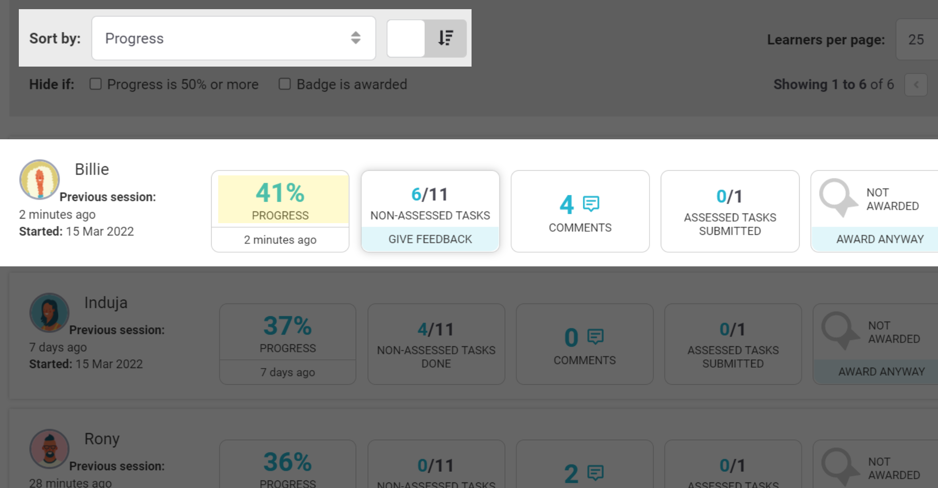 Billie will probably have one of the highest progress values in your class. Sort the console to easily see if there are any learners well ahead of the rest.