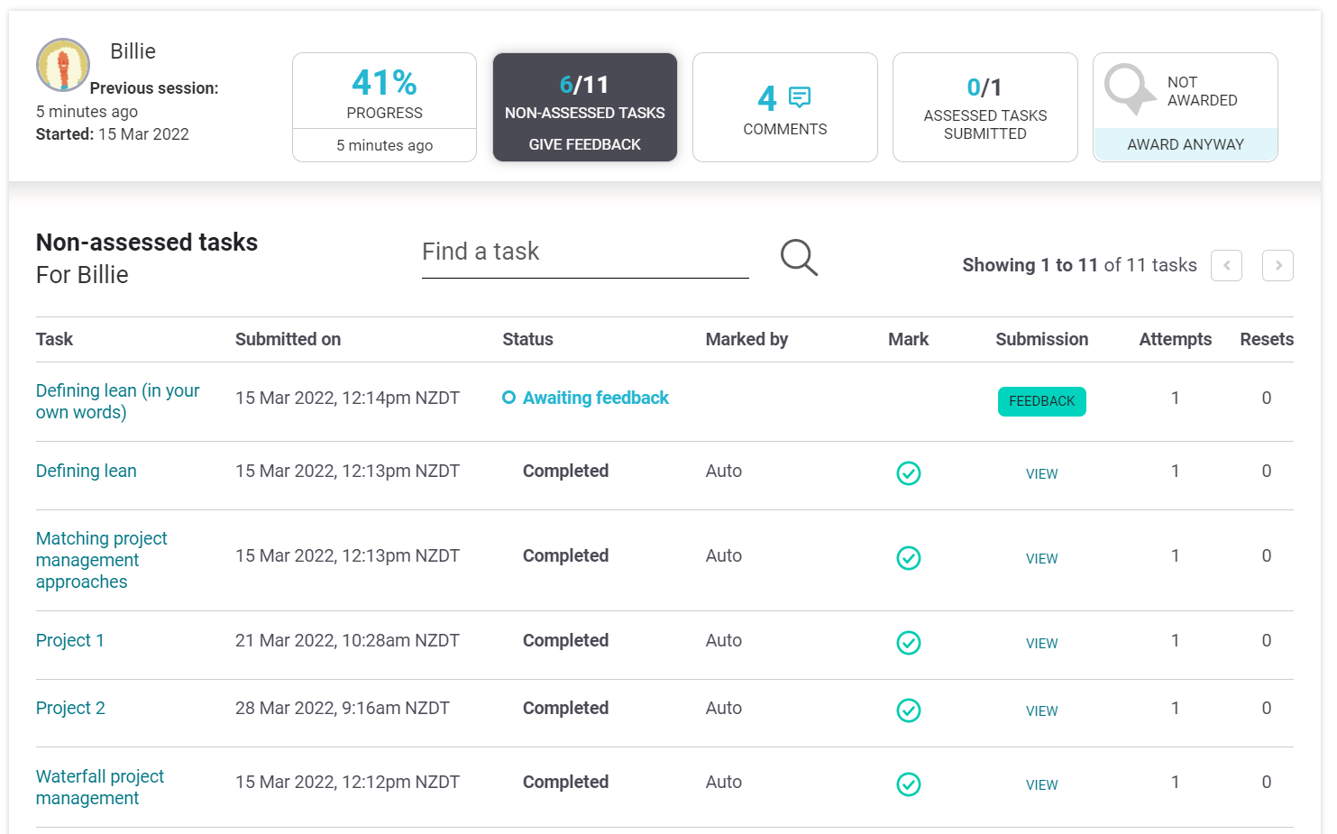 Billie will also have loads of green check marks for the automarked tasks on her list and no (or few) re-attempts.