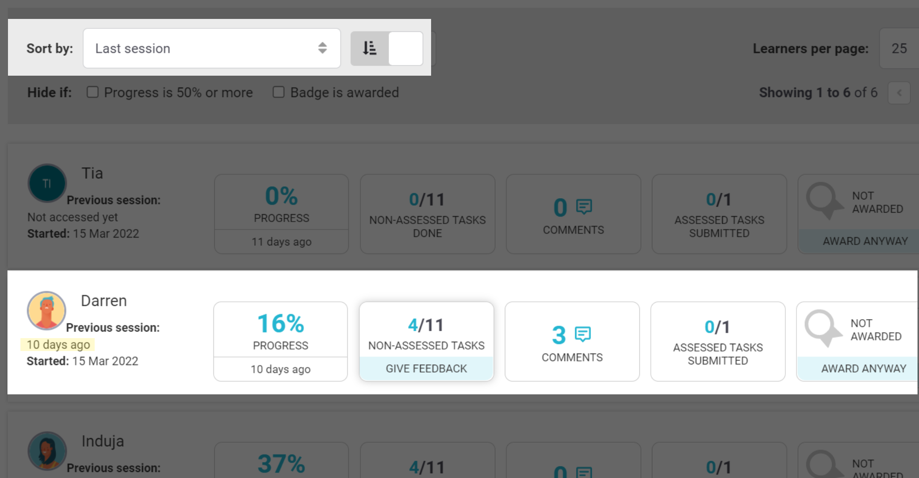If both Time since progress increase and Previous session are similar e.g. 10 days ago, then Darren could do with a quick reminder to pop back into the course. Something like: