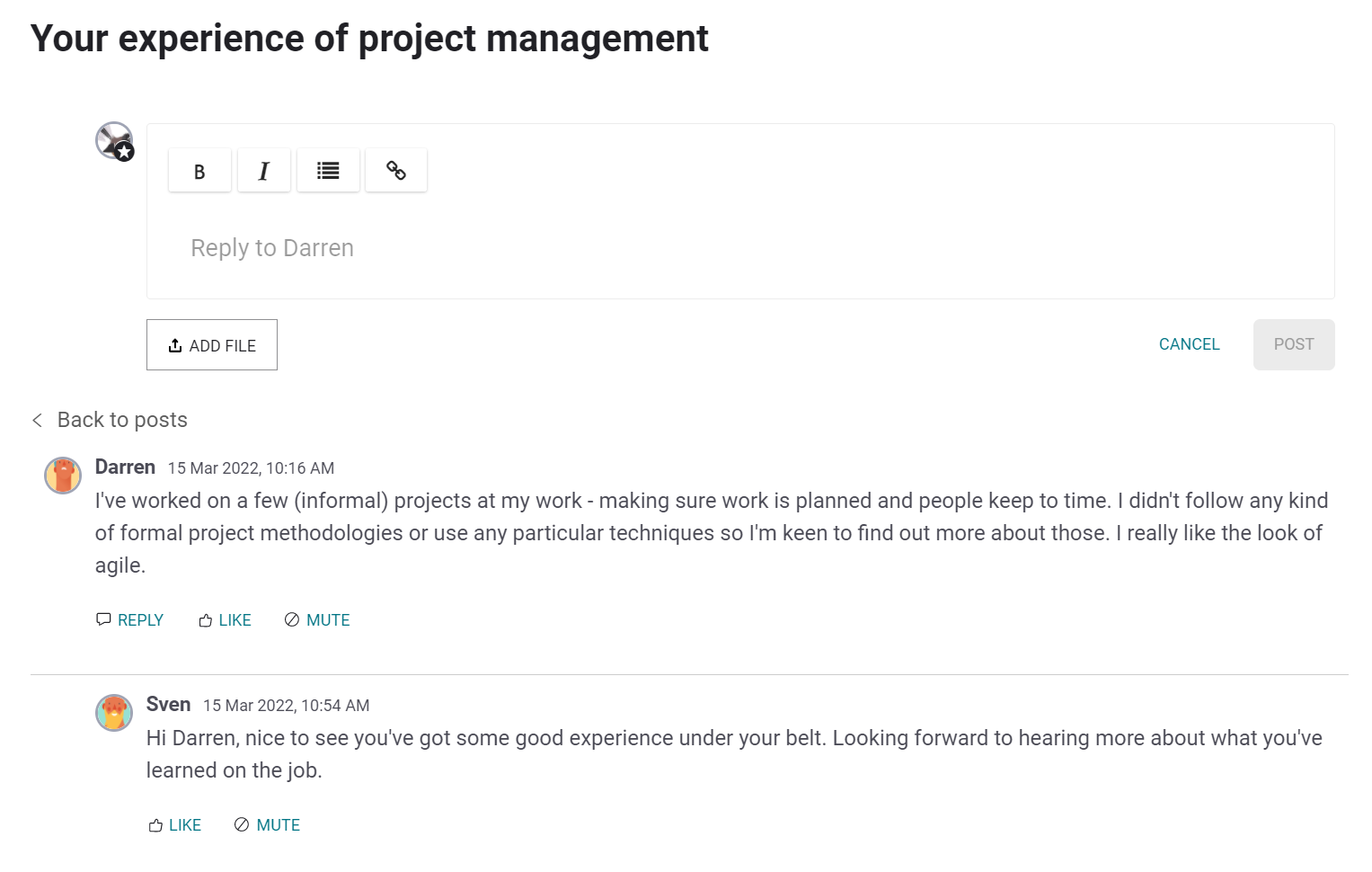 He might not be the learner to keep the conversation going (as he doesn’t log on regularly) but his enthusiasm might get others started, and he might even be keen to contribute a summarising post.