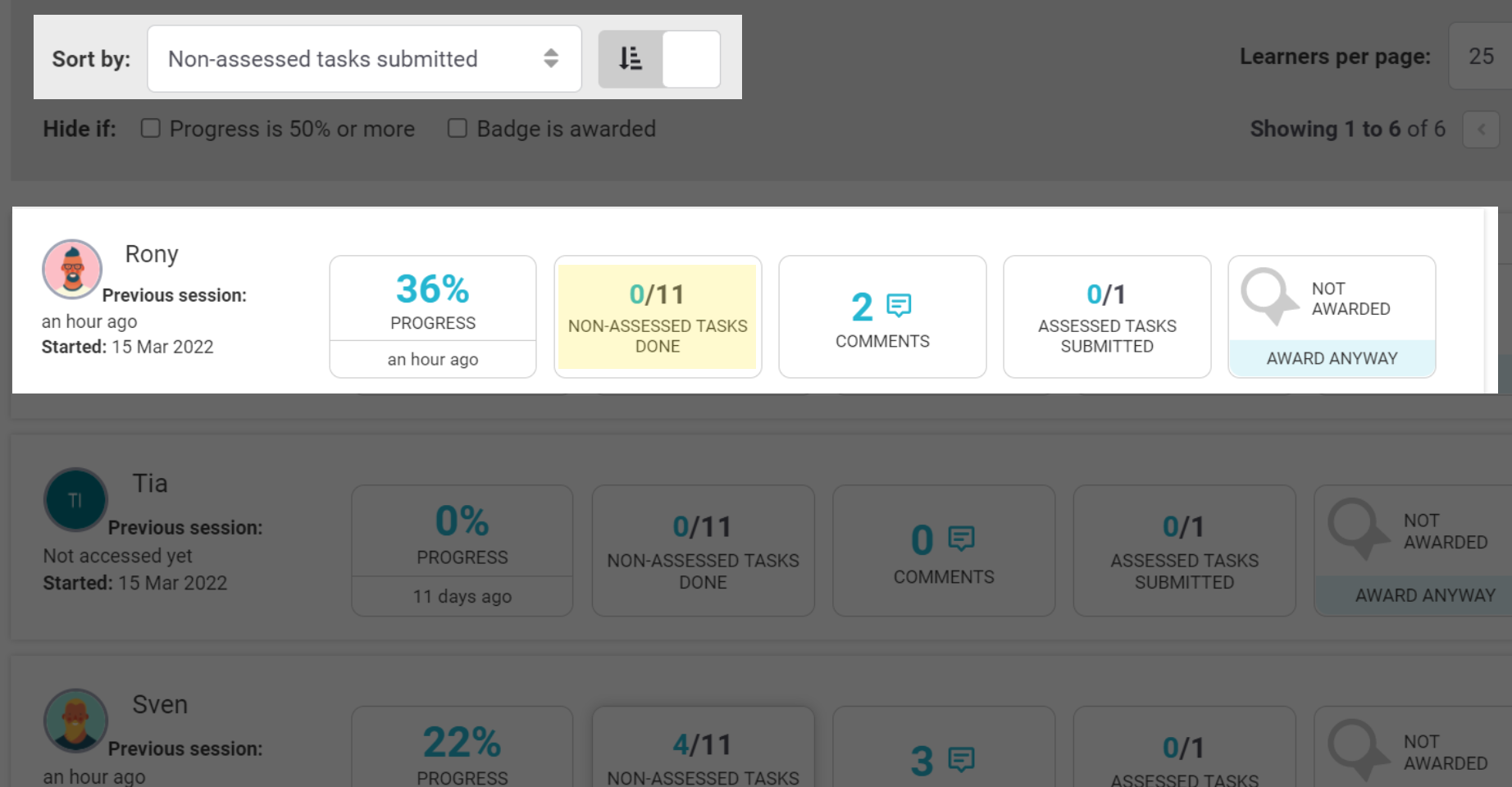 Rony’s been rushing through the pages, but not completing any of the tasks! You can spot Ronys by sorting by non-assessed tasks submitted.