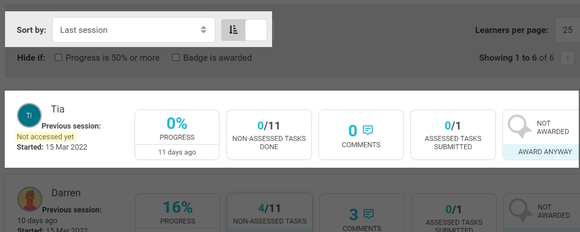 Tia is likely having trouble either getting into the system or finding her way around once she’s logged in. You can spot Tia first by looking for learners who show as Not accessed yet.