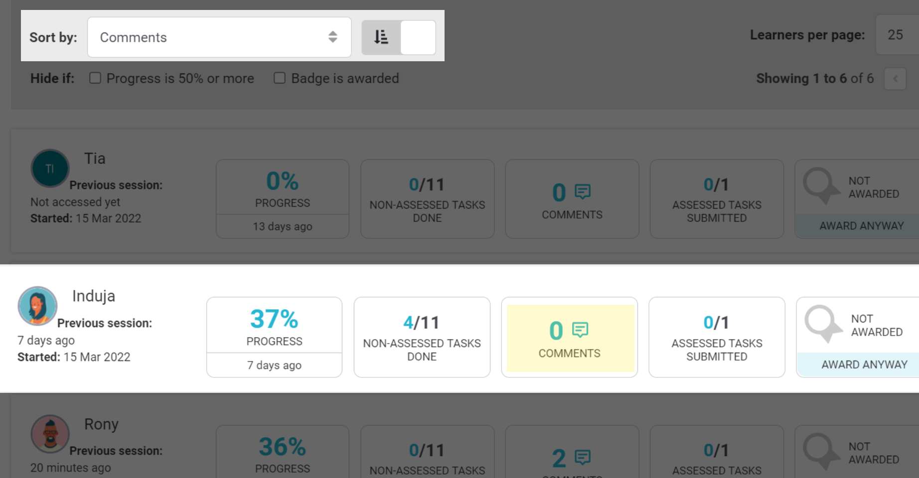 Induja’s been working through the course, but not really joining in. You’ll spot Indujas when you sort by comments.
